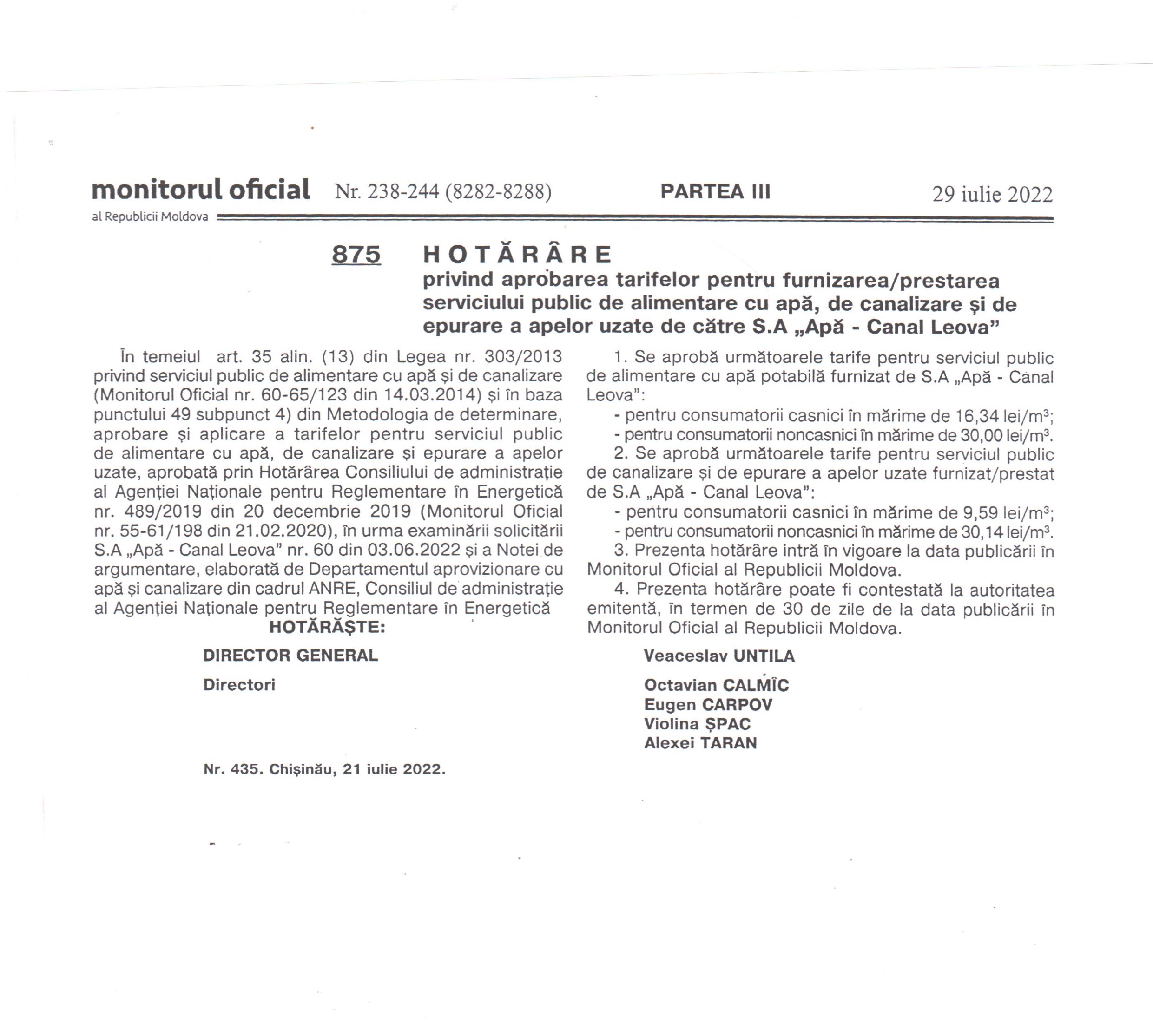 Hotărîrea ANRE tarife AC Leova